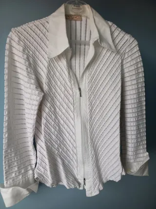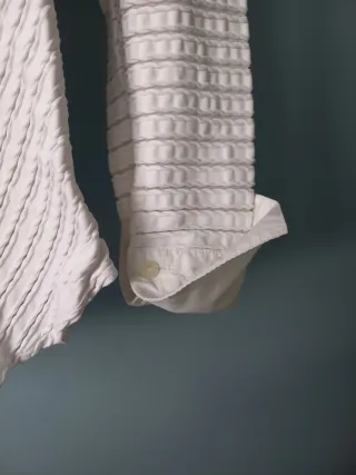 Camisa blanca con un diseño de tejido semitransparente y elástico. - Cierre de cremallera frontal. - Mangas largas y con detalle de puño vuelto. - Cuello camisero.