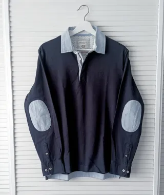 Polo clásico de manga larga con un diseño moderno y detalles distintivos. - Cuello camisero con solapa. - Parches de tela en los codos. - Puños con botones.