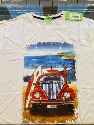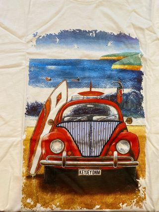 Camiseta de manga corta con un diseño veraniego y retro. - Estampado frontal de un coche clásico rojo en la playa con una tabla de surf. - Cuello redondo. - Sin estrenar, con etiqueta.