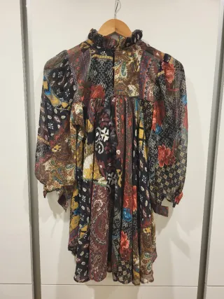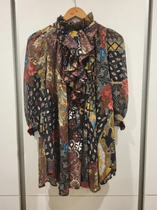 Camisa de mujer multicolor con volantes en la parte delantera. - Cuello alto con volantes. - Mangas francesa abullonadas. - Estampado patchwork de inspiración paisley y floral. Le falta un boton en la manga