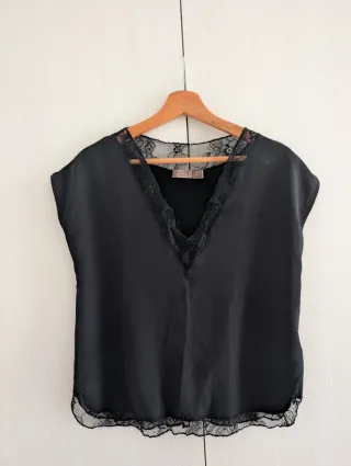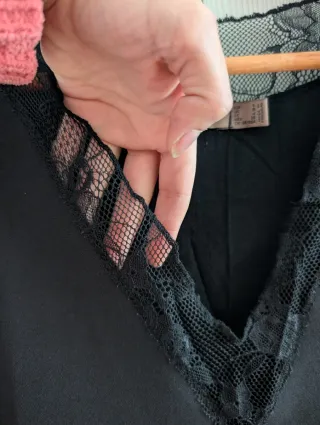 Camiseta negra con detalles de encaje en cuello y bajo. - Manga corta. - Cuello redondo con detalle de encaje. - Bajo con borde de encaje. Es una s grande. Está entre la s y la m.