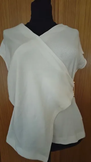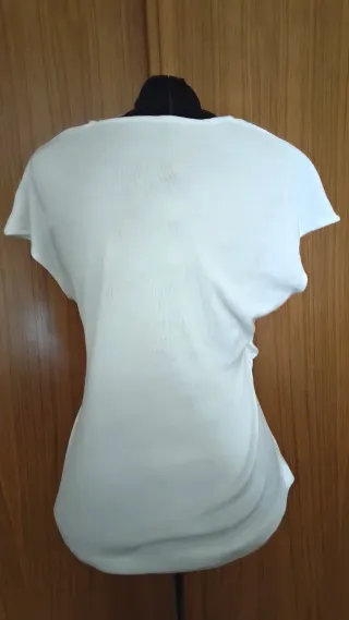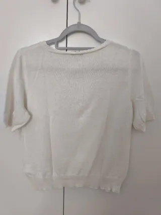 Camiseta en manga corta, hasta encima del codo, con acabado en puño ligero. Diseño de cuello redondo y detalle de botones. - Manga corta. - Cuello redondo. - Cierre de botones. Tono blanco roto. Ancho de axilas 40 cm Largo 58 cm SIN ESTRENAR ✨✨