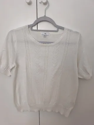 Camiseta de punto fina en color blanco. Presenta un diseño calado con detalles en zigzag en la parte delantera y un acabado festoneado en el cuello y bajo. - Manga corta. - Cuello redondo. - Tejido ligero.