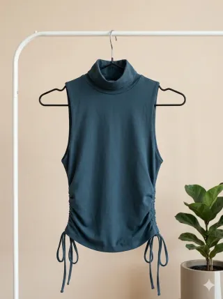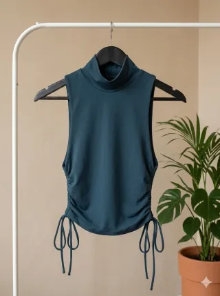 Top de Zara con cuello alto y diseño sin mangas. Presenta un detalle de fruncido lateral con cordones ajustables. - Tejido suave y elástico. - Fruncido lateral con cordones. - Cuello alto.