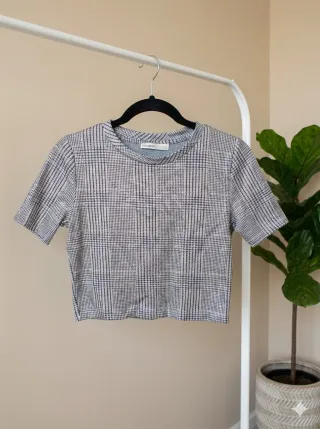 Camiseta de Zara con un tejido que aporta un toque de brillo. Pone talla M pero también creo valdría para una talla L. - Diseño de canalé vertical. - Manga corta. - Cuello redondo.