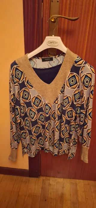 Camiseta de manga corta con un diseño gráfico moderno, con un estampado geométrico en tonos azules y anaranjados. Cuello redondo. Muy buen estado
