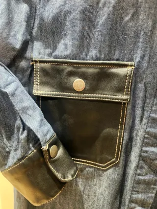 Camisa vaquera de Zara con detalles en polipiel. Talla XS grande. Da S y M. - Dos bolsillos frontales con solapa y botón. - Puños y bajo de la manga con detalle en polipiel. - Costuras blancas decorativas.