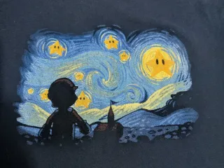Camiseta con un diseño inspirado en la noche estrellada de Van Gogh y Mario Bros. - Estampado frontal. - Manga corta.