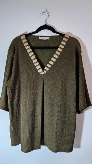 Camiseta de mujer con un diseño vibrante y moderno.Se puede entregar en el toscano, Salamanca - Estampado abstracto en tonos verdes y multicolor. - Cuello en V con detalle. - Manga 3/4.