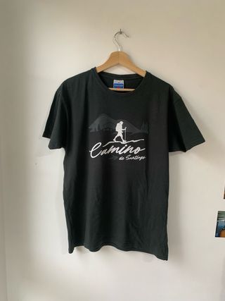 Camiseta negra con estampado del Camino de Santiago. - Diseño gráfico de peregrino y paisaje. - Cuello redondo. - Manga corta.