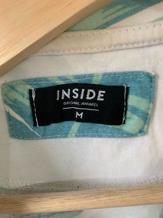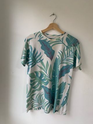 Camiseta con un llamativo estampado de hojas tropicales en tonos verdes y blancos. Perfecta para un look casual y fresco. - Diseño de hojas verdes y moradas. - Cuello redondo. - Manga corta. Tiene unas manchas amarillentas en el cuello