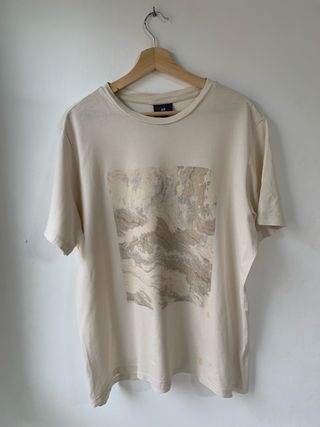 Camiseta de manga corta con un diseño abstracto en el frontal. - Color beige. - Estampado en tonos tierra y grises. - Cuello redondo. Tiene manchas amarillentas abajo
