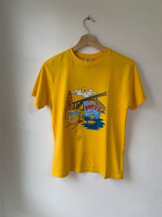 Camiseta de manga corta con un divertido estampado inspirado en Oporto. Presenta un tranvía amarillo, el puente Dom Luís I y un sol sonriente. - Diseño gráfico de Oporto. - Cuello redondo. - Manga corta. Tiene manchas grises como se ve en la foto
