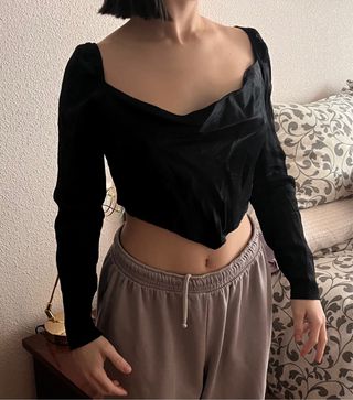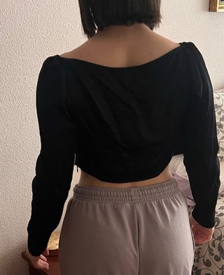 Elegante top de satén con manga larga. - Diseño con escote pronunciado. - Corte asimétrico. - Tejido suave y brillante.