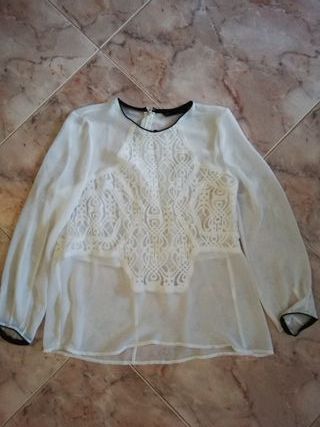 Blusa de encaje con cuello redondo de polipiel. Medidas: 48 cm de axila a axila, 63 cm de largo.