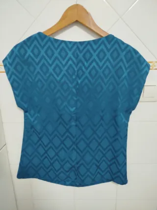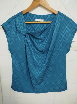 Camiseta de Mango con un diseño geométrico en tonos azules y turquesas. Presenta un drapeado frontal con un nudo. - Tejido con estampado de rombos. - Manga corta. - Cuello redondo.