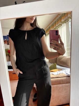 Camiseta negra con un diseño elegante y moderno. - Escote con abertura. - Manga corta. - Corte holgado.