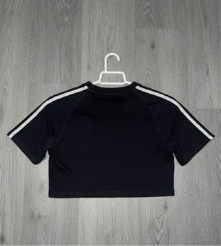 Camiseta corta de Adidas en color negro. Diseño deportivo con las icónicas tres rayas blancas en las mangas. - Logo de Adidas bordado en el pecho. - Mangas cortas. - Corte crop top.