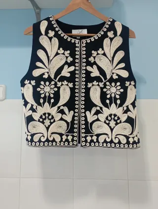 Elegante chaleco de estilo étnico con un diseño bordado. - Bordado detallado en color beige. - Corte sin mangas. - Cierre frontal con ganchito. Marca JS Milenium, talla única cono M/L