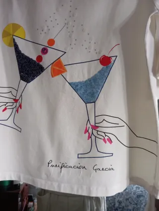 Camiseta blanca con un divertido estampado de cócteles y manos. - Diseño original de Purificación García. - Mangas acampanadas. - Detalles brillantes en el estampado.