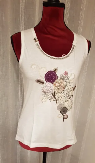 Camiseta sin mangas de Mango con un diseño floral bordado en la parte delantera. El tejido tiene una textura sutil. - Diseño floral bordado. - Cuello redondo. - Sin mangas.