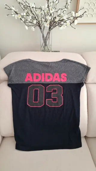 Camiseta de manga larga de Adidas con un diseño distintivo. - Mangas con las icónicas tres rayas. - Logo de Adidas en el pecho. El tejido es elastico Tiene dos pequeños agujeros como se ve en la ultima foto.