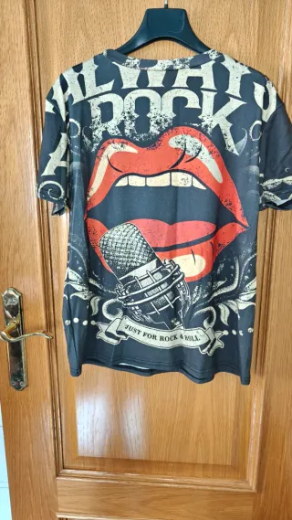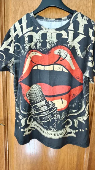 Camiseta con un llamativo estampado inspirado en el rock and roll. - Diseño frontal con labios rojos, micrófono y texto Just for Rock & Roll. - Estampado integral con letras y motivos gráficos. - Cuello redondo y manga corta. Camiseta de Shein, nueva. Talla: S , no negociable.
