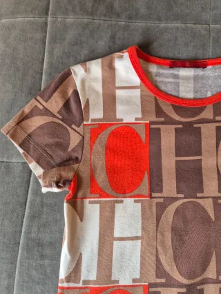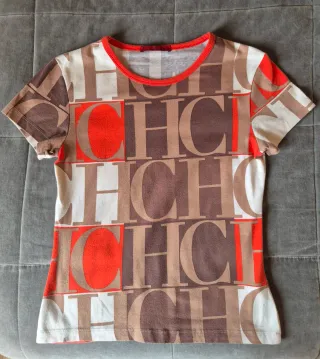 Camiseta de manga corta con estampado de logo. - Diseño con el monograma CH de Carolina Herrera. - Combinación de colores marrón, beige y naranja. - Cuello redondo. - Ligeramente elastica. - En muy buen estado.