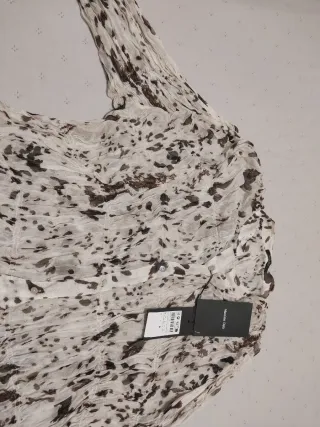 Blusa con un diseño único y llamativo. - Tejido ligero y vaporoso. - Estampado de manchas en tonos blanco y marrón. - Detalle de fruncido en la parte superior.