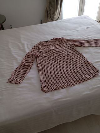 Preciosa blusa de cuadros de Massimo Dutti. Es de manga larga y tiene un corte clásico. - Está en muy buen estado. - Perfecta para cualquier ocasión. Blusa Estampada a Cuadros Massimo Dutti de Mujer. Cuello en forma de V con tres botones para cerrar y con dos iras Anchas en Solapas para Anudar. Manga Larga con cierre de empuñaduras con Botón. Bajo Ovalado. Bolsillo Frontal Superior Izquierdo con cierre de botón. Diseño de Estampado de Cuadros. Tela Fina, muy Suave, Transpirable y Fresca. -Marca: Massimo Dutti. -Composicion: 100% Algodón. -Color: Burdeos// Varios. -Talla: 38. -Estado: Muy Bueno.