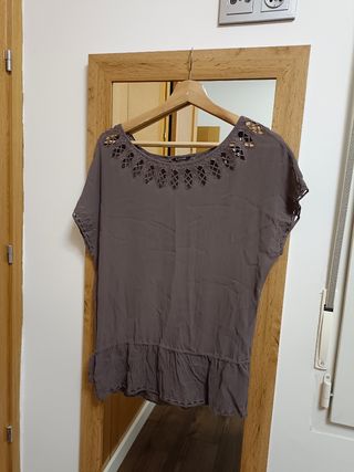 Blusa de color azul turquesa. Bordada con manga francesa. Tela de camisa por delante y de camiseta por detrás. Muy comoda. De Massimo Dutti, talla S. Puesta en 2 ocasiones.