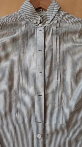 Lleva una cinta con un botón detrás del cuello para poder hacer un lazo de múltiples formas así como quitarlo. También lleva un botón delante para poder dejar el cuello cerrado o escote. Talla 36-38. Precio original: 89’99€. Solamente envíos.