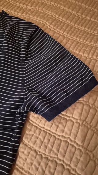 En perfectas condiciones. Utilizado solo en una ocasión. Polo de Massimo Dutti azul oscuro con rayas grises. Con cremallera en el cuello y coderas. Talla M.