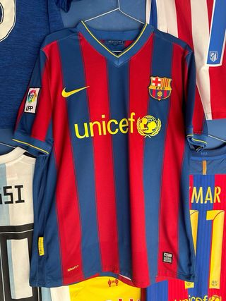 Camiseta de fútbol del FC Barcelona de la temporada 2009-2010, con el dorsal y nombre de Messi. Original. Talla M. - Diseño a rayas rojas y azules. - Detalles dorados en el nombre y número.