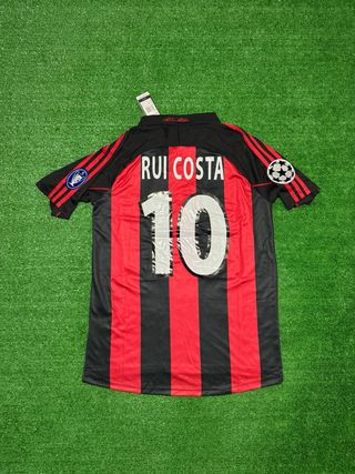 Camiseta de fútbol con el dorsal 10 y el nombre Rui Costa. - Diseño a rayas rojas y negras. - Parche de la Champions League en la manga. - Logo de Adidas en la manga.
