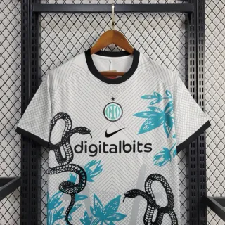 Camiseta del Inter de Milán con un diseño llamativo. 6,1,1,2,5,3,0,5,7 - Detalles de serpientes y hojas en color azul. - Cuello y mangas con ribete negro.