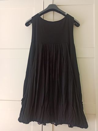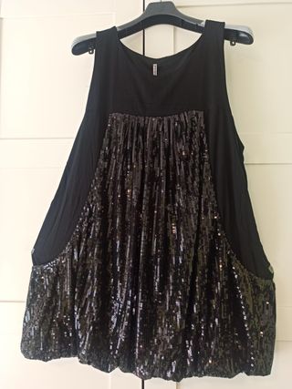 Precioso vestido bombonera, color negro, con miles de lentejuelas. Juvenil, ideal para ir guapa en Navidad o cualquier evento. Pertenece a una boutique de tallas grandes, por lo que su talla XX corresponde a una 56-58. La modelo mide 1,75m. y lleva tacón, por lo que normalmente queda más largo de lo que parece en la foto. - Fabricado en España. - Diseño sin mangas, tipo pichi, para llevar con camiseta debajo (si se quiere), el vestido va forrado y es comodísimo. - Panel frontal y bajo con lentejuelas. - Bolsillos laterales.