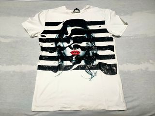 Camiseta Antony Morato original, color blanco, talla L. Diseño frontal tipo print artístico con rostro femenino y franjas negras estilo “rayas”, con detalle de labios en rojo. Corte regular, cuello redondo y manga corta. En muy buen estado, sin rotos ni desgaste visible.