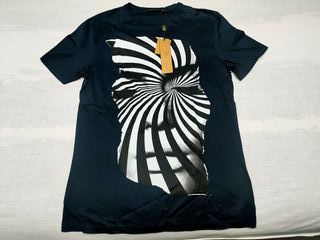 Camiseta Antony Morato en color marino talla L, con etiqueta aún puesta (nueva sin uso). Destaca por su estampado frontal grande tipo efecto óptico/espiral en blanco y negro, muy llamativo y con estilo moderno. Corte regular, ideal para looks casual o streetwear.