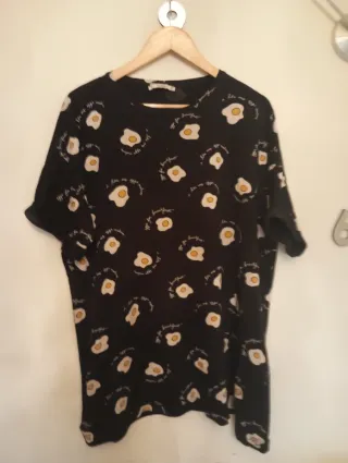 Camiseta de manga corta para mujer con un divertido estampado de huevos fritos y texto. - Diseño original. - Tejido suave y cómodo.