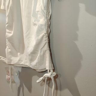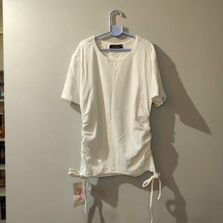 Camiseta blanca de manga corta con detalle fruncido ajustable a ambos lados mediante lazos. Tejido suave y ligero, corte cómodo y versátil. Perfecta para un look casual y combinable con cualquier prenda.