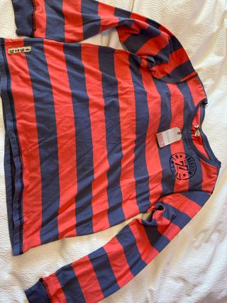 Camiseta de manga larga con un diseño de rayas llamativo. - Estampado de rayas - Cuello redondo. - Puños y bajo con acabado. - Detalle con número 77 Freedom Newyork en la parte superior izquierda. -Marca brotes- corte ingles, talla 214..14 años