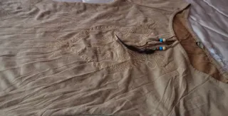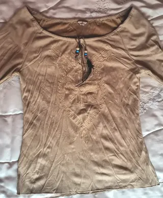 Camiseta de estilo indio con un diseño bordado en la parte delantera. Presenta un detalle de cordón con cuentas y plumas en el escote. Medidas: largo 60, cuello 35, hombro 48, manga 64 y 74. - Diseño bordado central. - Cierre de cordón con abalorios y plumas. - Mangas largas con puño abierto en triángulo. - Cuello ancho y abierto para llegar al hombro.