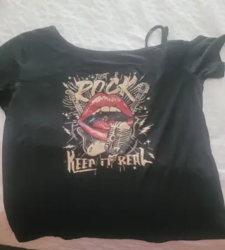 Camiseta con estampado rockero de labios y micrófono. Ideal para un look atrevido. - Diseño Just Rock Keep It Real. - Estilo off-shoulder con un tirante. - Manga corta.