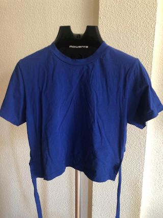 Camiseta corta de color azul con un diseño moderno y atrevido. Perfecta para combinar con tus looks de verano. - Corte crop - Detalle de tiras laterales -Traída de Corea -Usado una vez