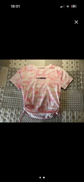 Camiseta con estampado en tonos rosas y blancos. Presenta un diseño fruncido en los laterales con cordones ajustables. Talla S, está en muy buen estado, se puede recoger en Alcalá de Henares o en Madrid en algunas ocasiones