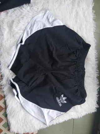 Conjunto deportivo de mujer, ideal para el verano. Compuesto por camiseta y pantalón corto. Es una xl pero pequeña será L real - Camiseta de manga corta con logo. - Pantalón corto con cintura elástica y detalles blancos.