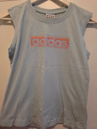 Camiseta sin mangas de Adidas en color azul claro. Presenta un logo de Adidas en naranja sobre un recuadro con un diseño de líneas y el logo repetido. - Camiseta sin mangas. - Logo Adidas en naranja.