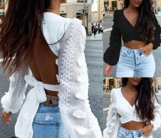 Elegante top blanco con un diseño moderno y femenino. Perfecto para cualquier ocasión. - Manga larga abullonada con detalles florales. - Escote cruzado. - Corte crop top. Tiene un roto pero que se puede coser