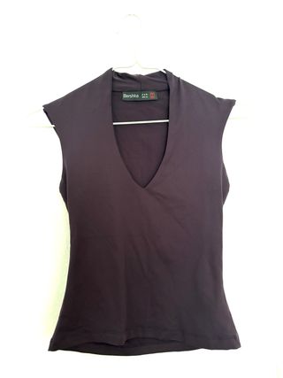 Camiseta sin mangas de Bershka con un diseño elegante y moderno. Escote pronunciado en pico. Se adapta al cuerpo, ideal con pantalones tiro alto. Es pequeña, luce bien en talla S. Si tienes dudas contacta sin compromiso.
